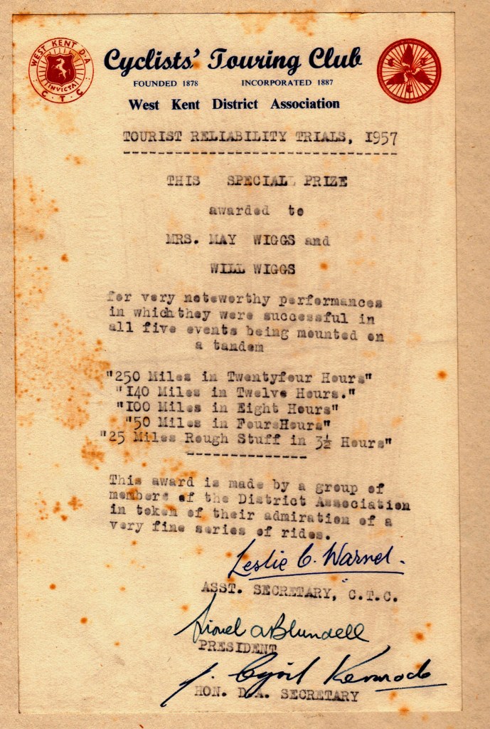In 1957 – when Grandad was 56 and Nan 49 – the West Kent District Association of the Cyclists’ Touring Club presented them with a book of cycling sketches by artist Frank Patterson as a special prize for “very noteworthy performances” in five events held as part of the association’s 1957 ‘Tourist Reliability Trials’.