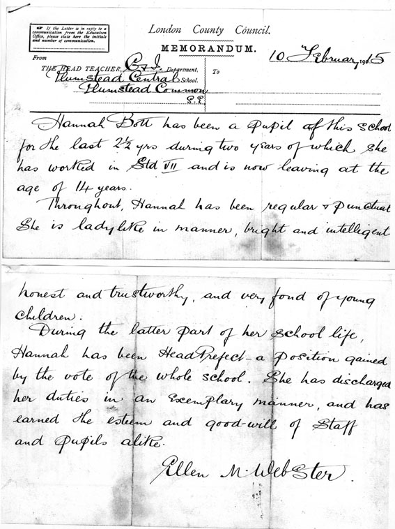 However, the 1911 census shows her living in Plumstead, and she was at school here until leaving aged 14. Hannah’s school report highlights the fact that she was elected head prefect following a school vote.