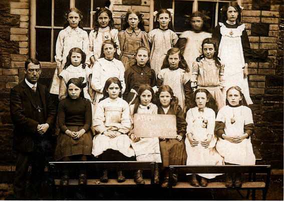 Postcard sent by Hannah (back row, second from left) to her mother of her at school in Ogmore Vale.