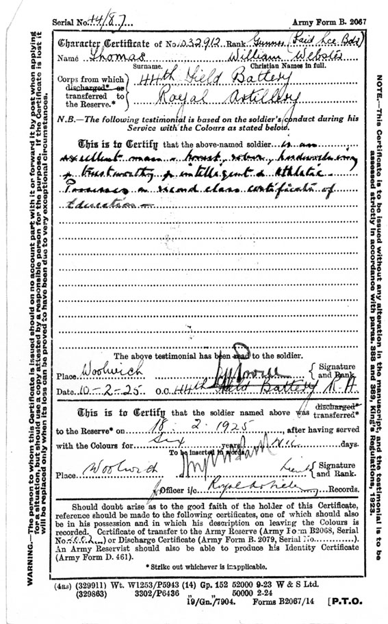 Will left the regular Army on 18th February 1925 and was transferred to the Army Reserve, of which he was a member until his discharge on 18th February 1931 (a few days before his 30th birthday).