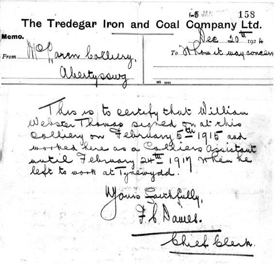 He started work for the Tredegar Iron & Coal Company on 1st February 1915 – not quite aged 14 – and was there for just over two years before leaving to work at somewhere called Tynewydd.