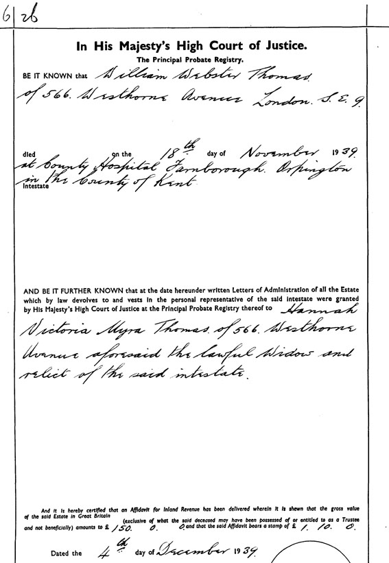 Hannah was widowed in 1939, at the age of 38, after nearly 16 years of marriage. She remarried on 11th February 1961 at Greenwich to Niels Magnus Anderson (1884-1972) – who I vaguely remember being called ‘Uncle Andy’. (My sister Megan recalls him as ‘Grandad Andy’ and says he was a neighbour of the Thomases for many years.)